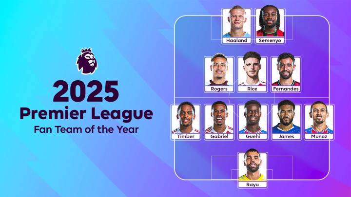 英超官方2025年度最佳阵容:哈兰德领衔,B费、赖斯、詹姆斯在列