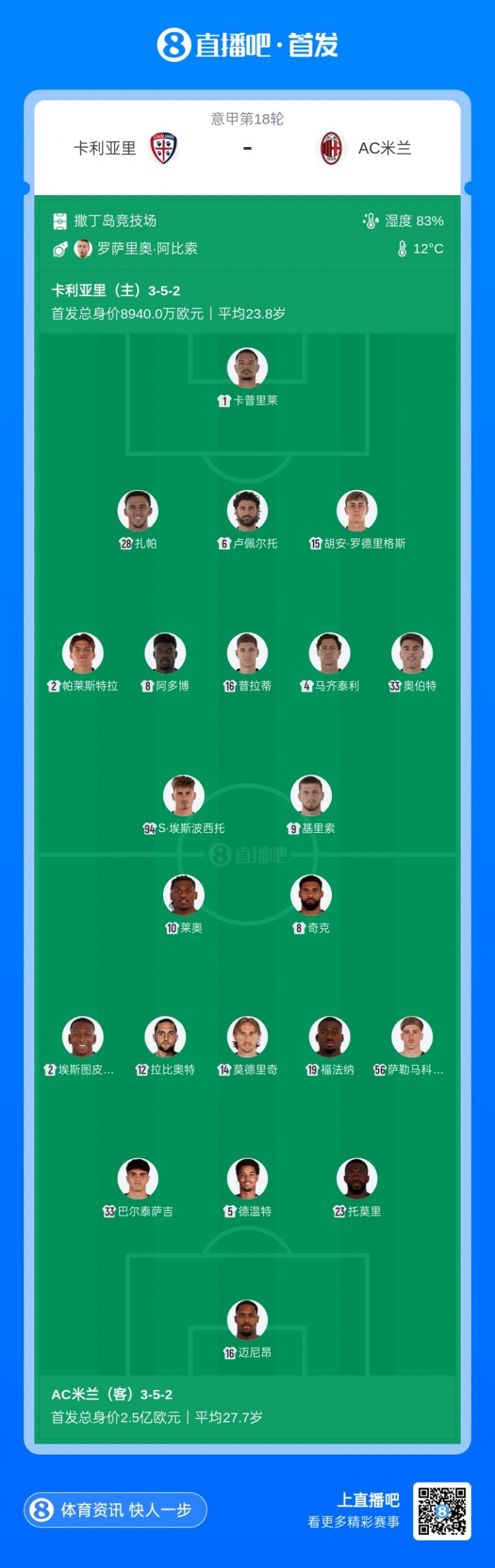 卡利亚里首发:1-卡普里莱、4-马齐泰利、6-卢佩尔托、15-胡安·罗德里格斯、28-扎帕、33-奥伯特、2-帕莱斯特拉、8-阿多博、16-普拉蒂、9-基里索、94-S-埃斯波西托