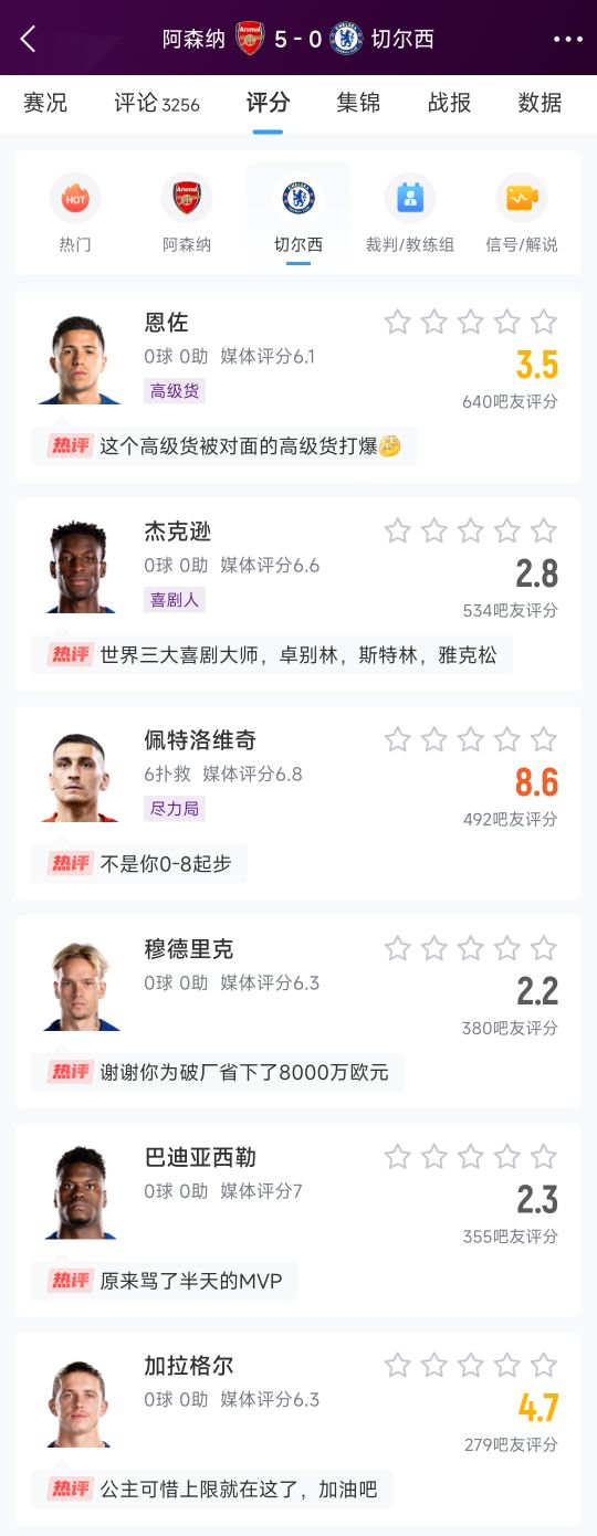 切尔西在今天凌晨的英超比赛0-5惨败阿森纳,赛后吧友们对切尔西球员均是一致的差评,仅有门将佩特洛维奇高分。吧友热议:戳>>