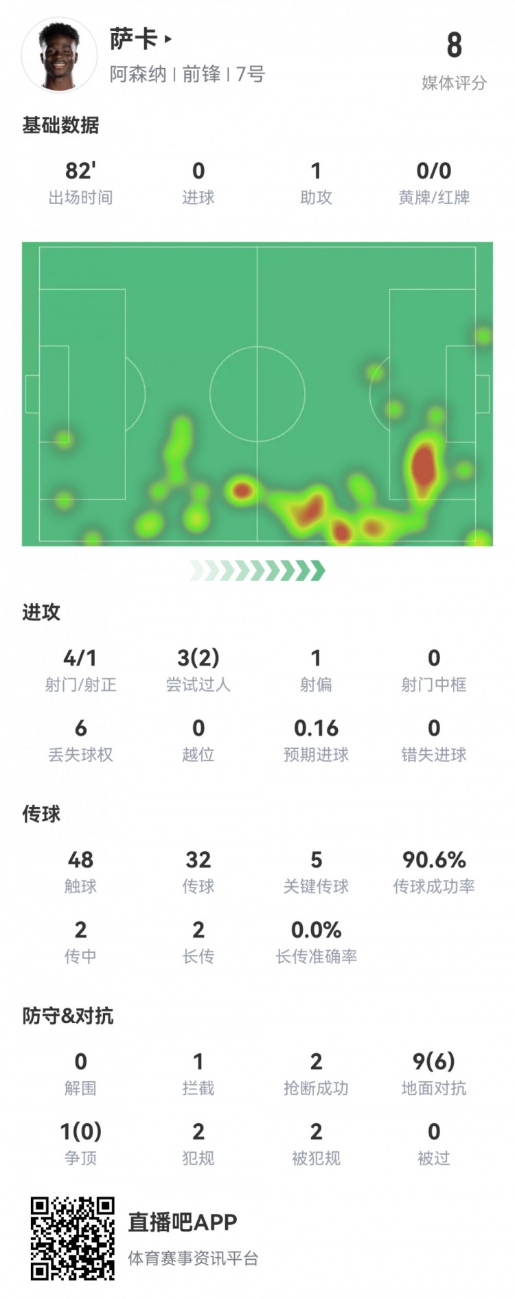 4月24日讯 英超第29轮补赛,阿森纳主场暂5-0领先切尔西。此役萨卡首发82分钟被换下,球员全场重点数据如下↓