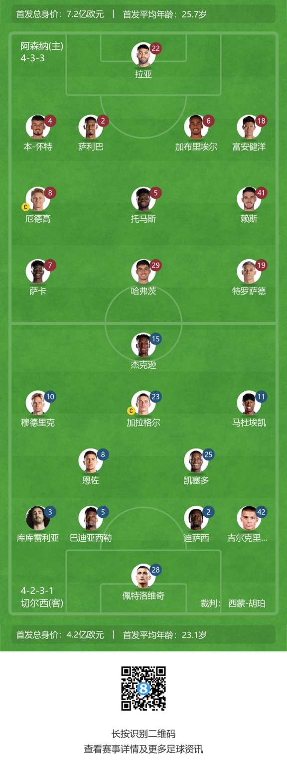 阿森纳首发:22-拉亚、4-本-怀特、2-萨利巴、6-加布里埃尔、18-富安健洋、8-厄德高、5-托马斯、41-赖斯、7-萨卡、29-哈弗茨、19-特罗萨德