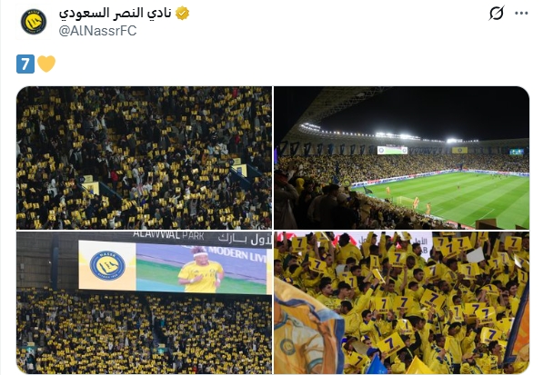 利雅得胜利也力挺自己的队长,他们社媒晒出了球迷声援C罗的照片:7️⃣