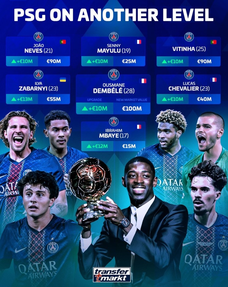 10月10日讯 德转更新了法甲球员身价,其中巴黎多人身价上涨,具体如下: